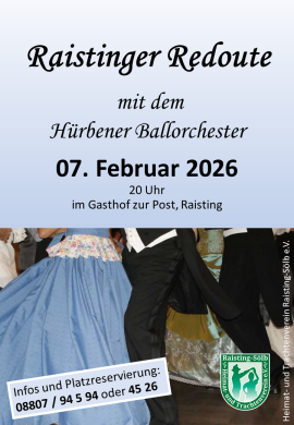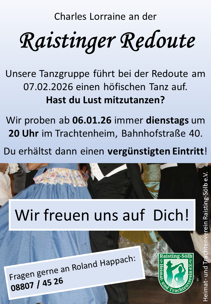 Am Samstag, den 07.02.2026 findet unsere alljährliche Raistinger Redoute statt. Unsere Tanzgruppe führt dort den Tanz "Charles Lorraine" auf.