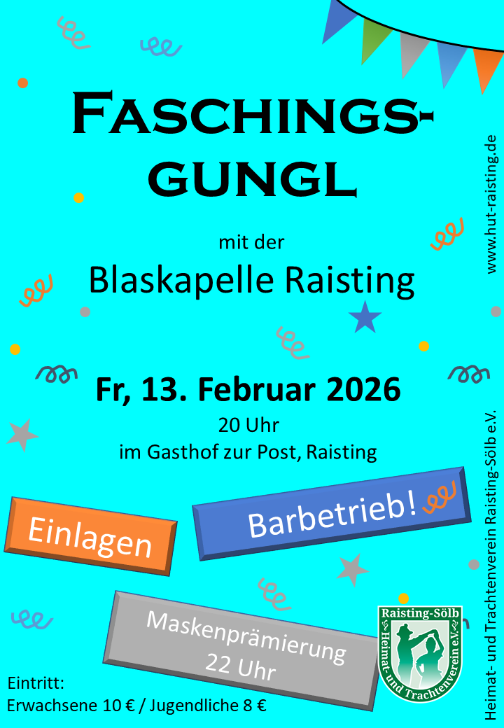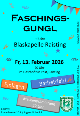 Am ruaßig'n Freitag, den 13. Februar 2026, ist es wieder soweit! Der Trachtenverein lädt um 20:00 Uhr zur Faschingsgungl in den Gasthof zur Post ein.